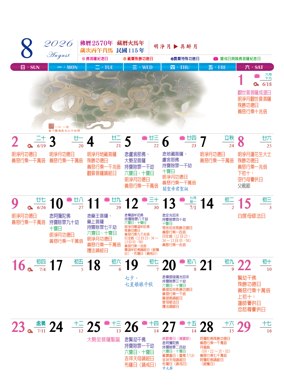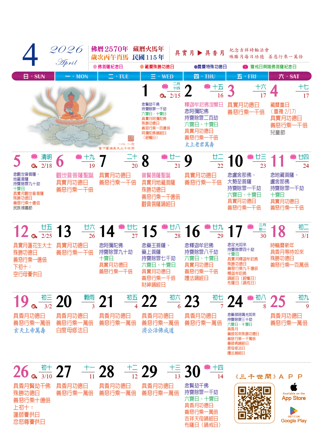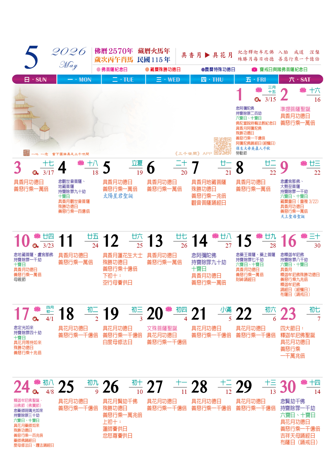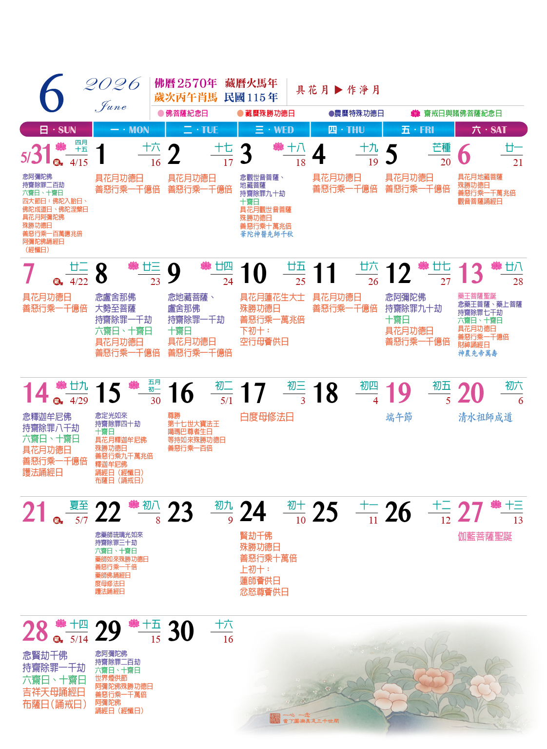 延續多年的〖修行日曆〗的設計考量在月曆上詳細記載佛誕日、齋日以及功德日,就是為了每天看到月曆都能提醒自己 - 日日是修行日。