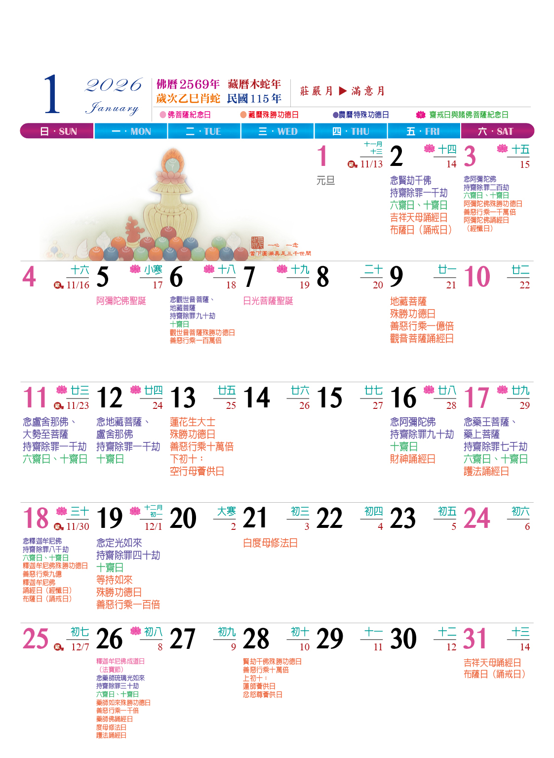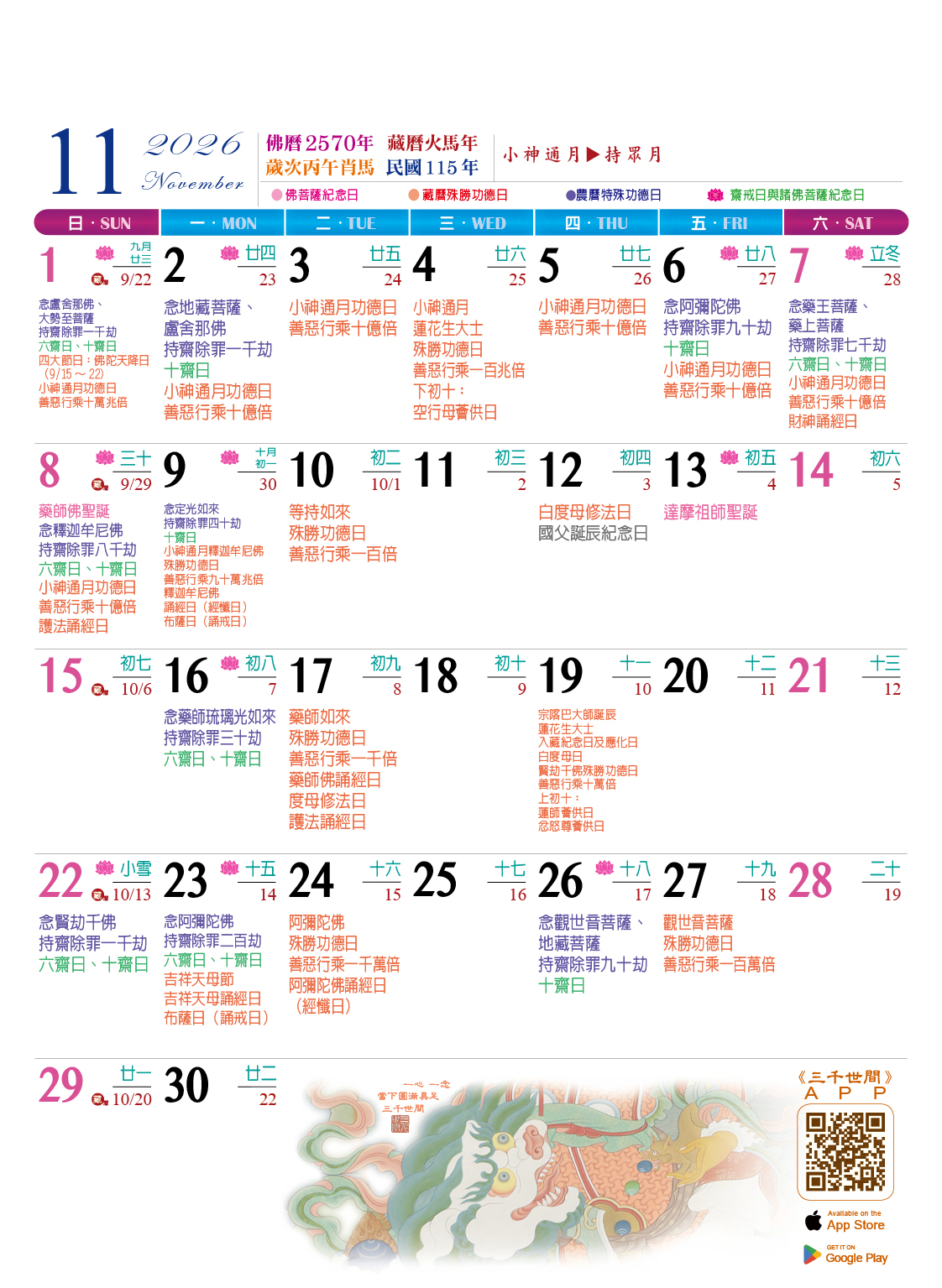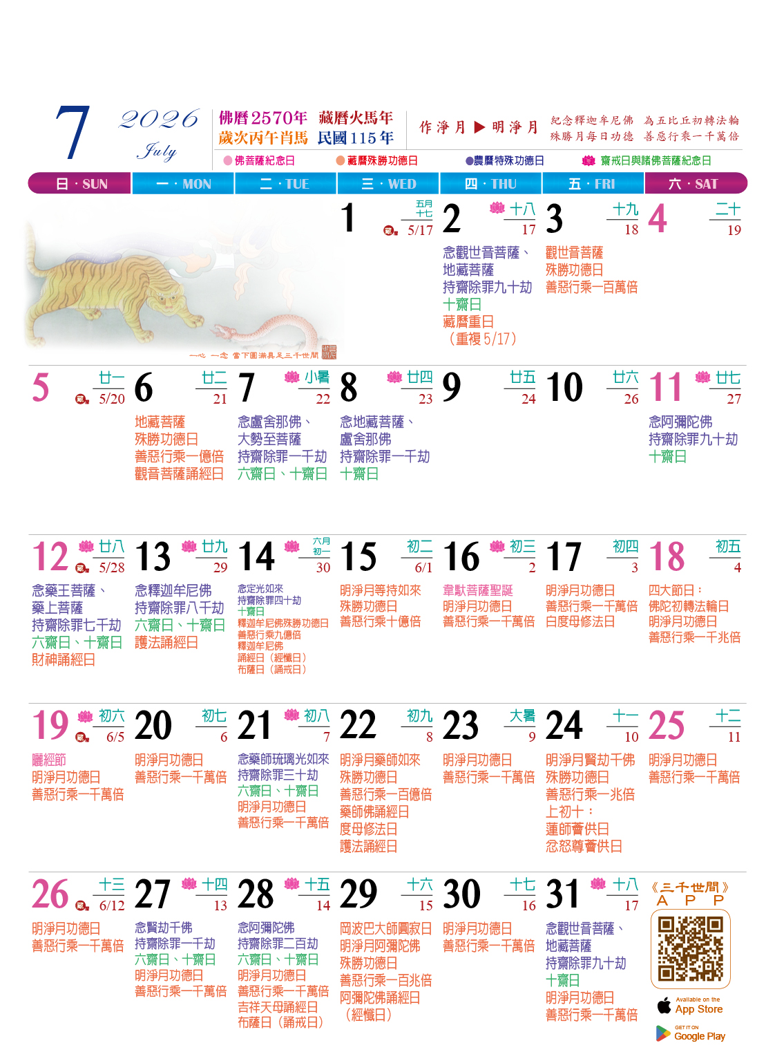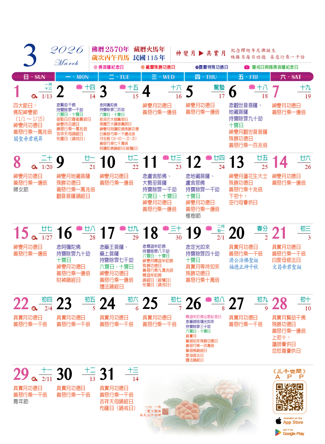 延續多年的〖修行日曆〗的設計考量在月曆上詳細記載佛誕日、齋日以及功德日,就是為了每天看到月曆都能提醒自己 - 日日是修行日。