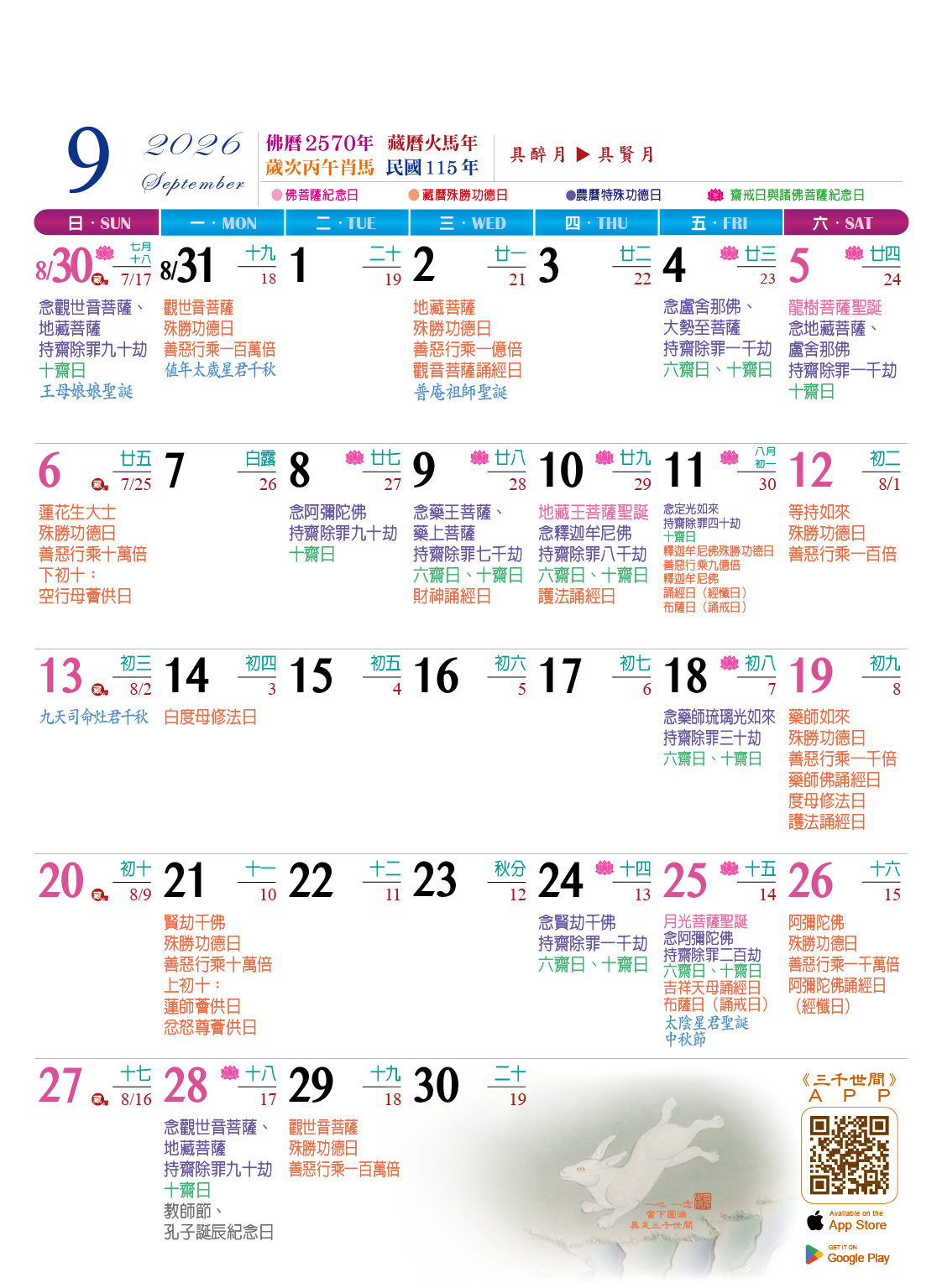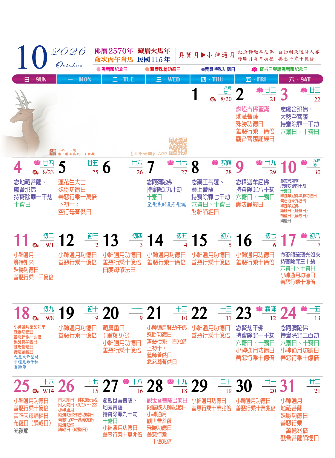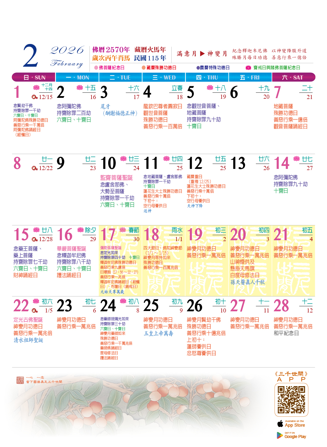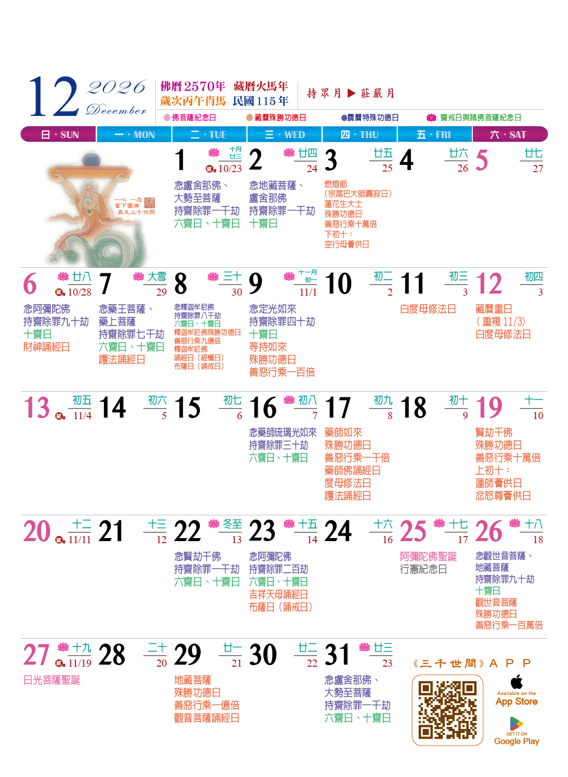 延續多年的〖修行日曆〗的設計考量在月曆上詳細記載佛誕日、齋日以及功德日,就是為了每天看到月曆都能提醒自己 - 日日是修行日。