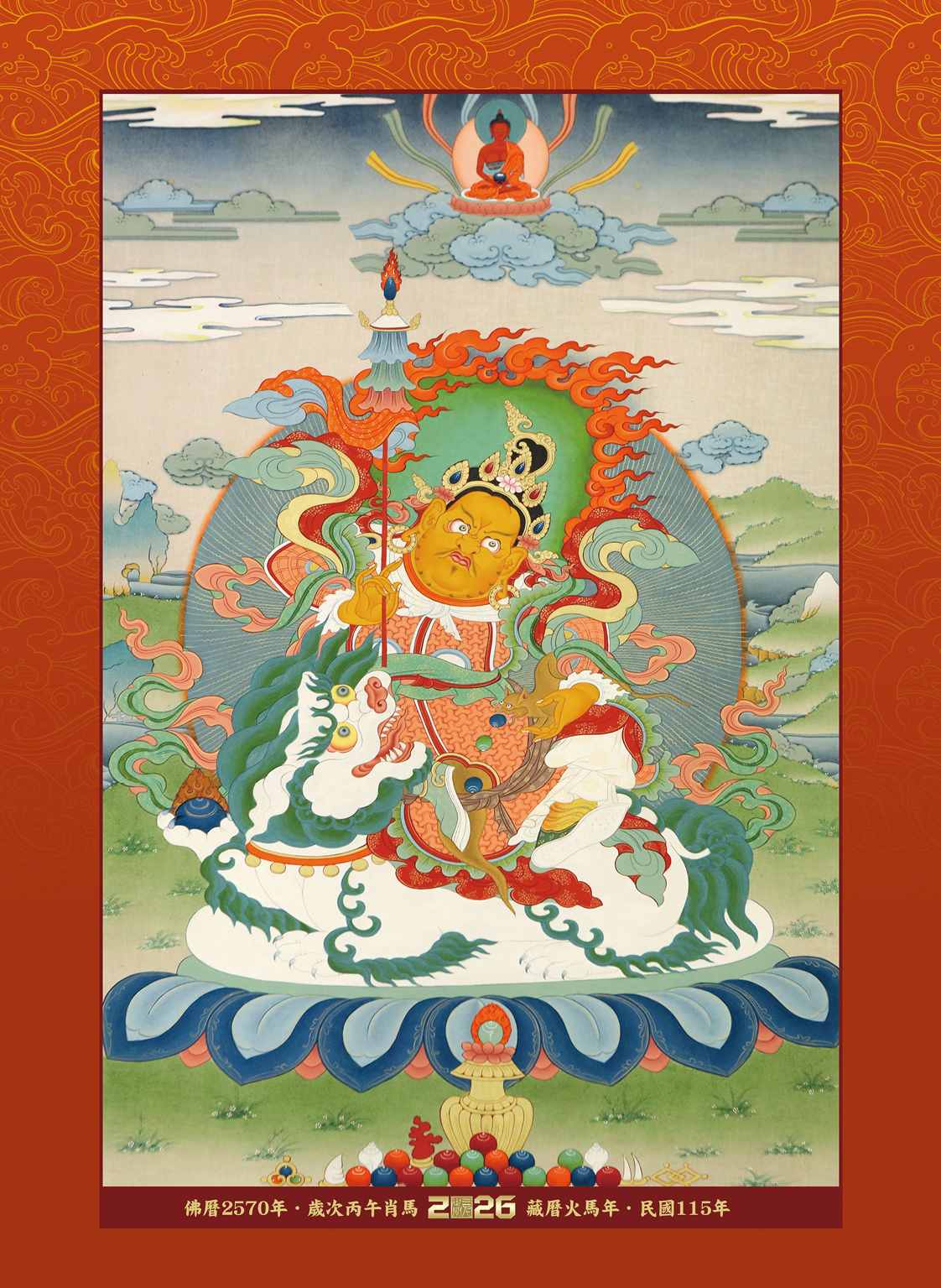 桌曆、日曆手冊的封面為財寶天王,是鎮守北方,為財富與福德的守護者,曾誓願護法利生。供養可祈求事業順遂、財源增長、遠離障礙、增長智慧。